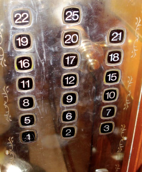 The floors follow in a predictable pattern: Lobby, 2, 3, 4, and so on. Eventually you get to 12. The floor on top of the twelfth floor is...the fourteenth floor.